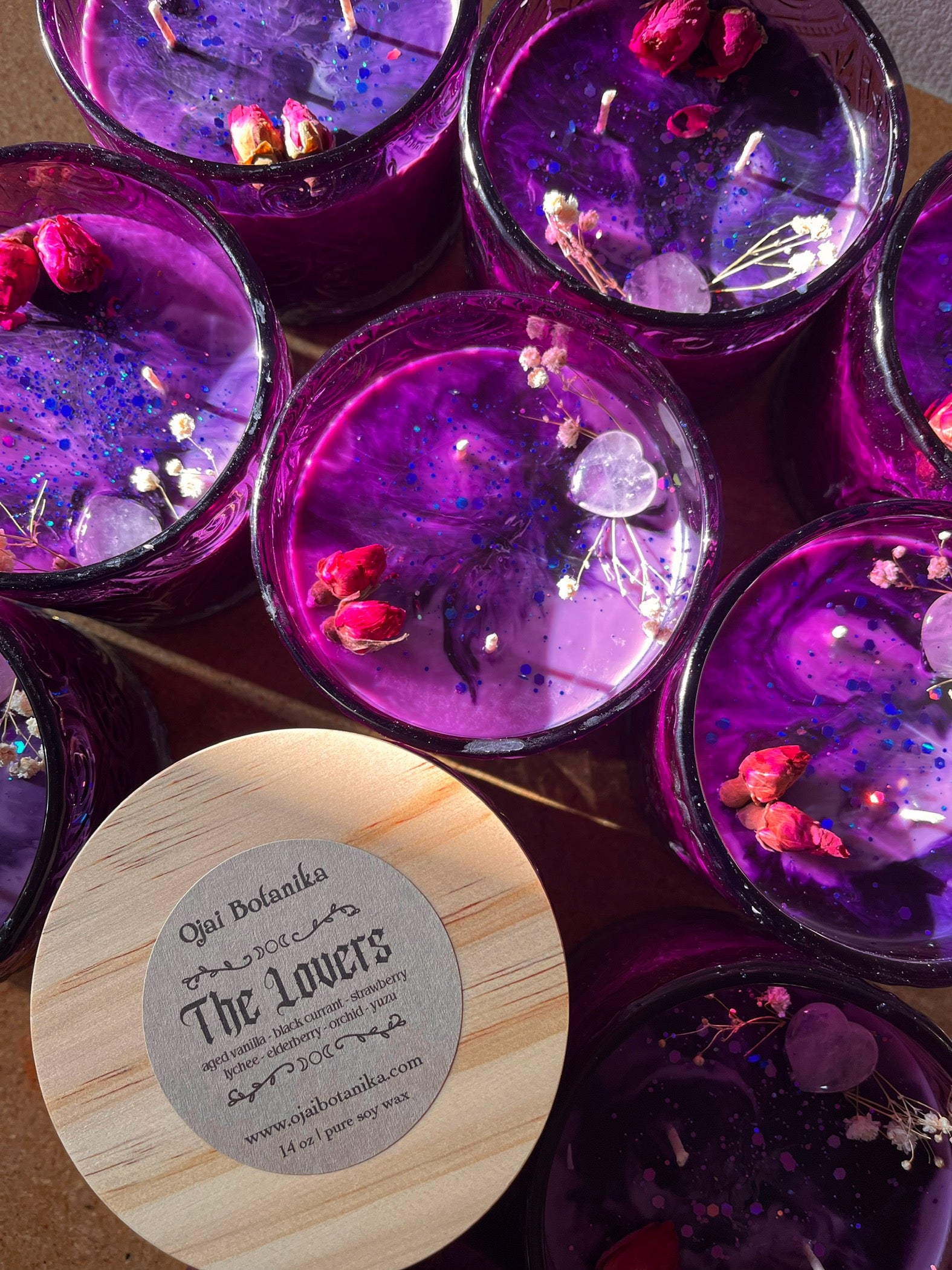 The Lovers Tarot inspired candle scented with notes of aged vanilla, black currant, strawberry, lychee, elderberry, yuzu and orchid. Adorned with a rose quartz heart crystal, dried rose buds, baby’s breath and non toxic candle safe biodegradable glitter.💘